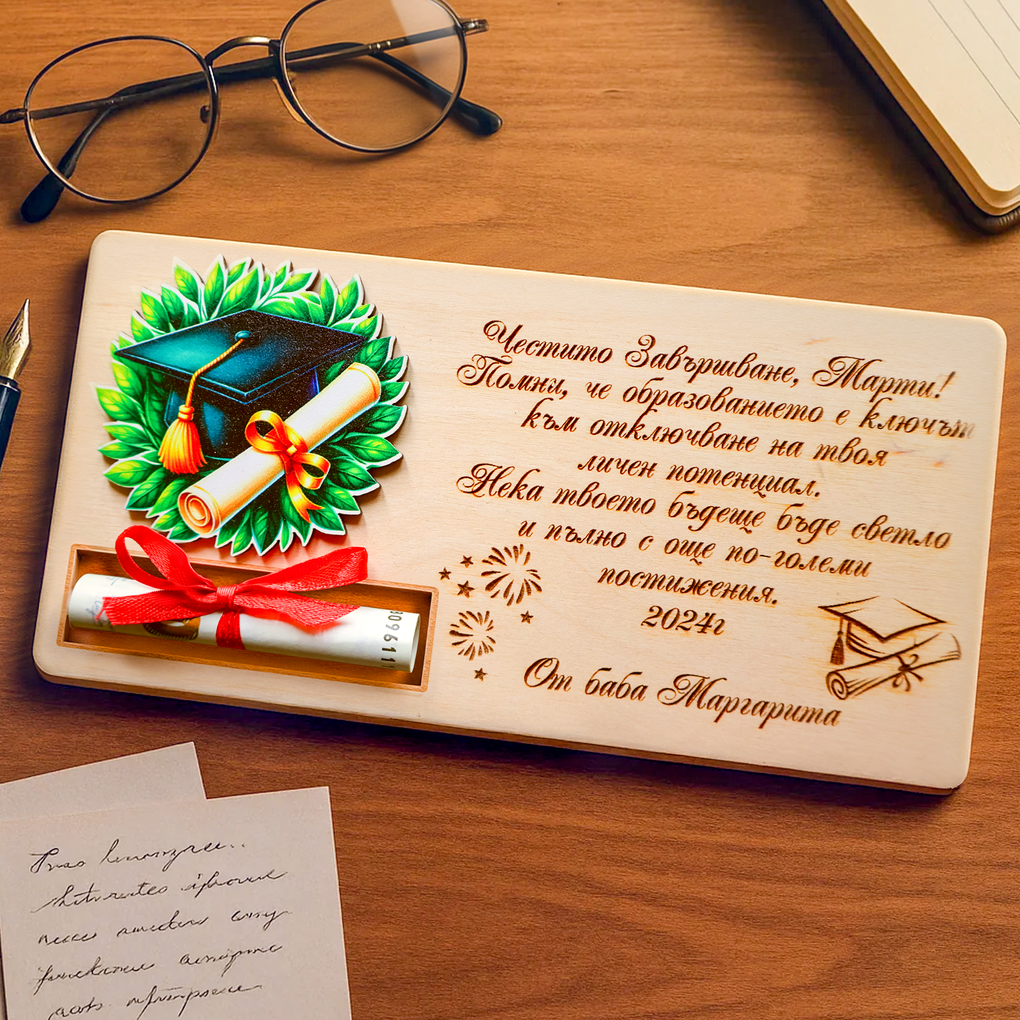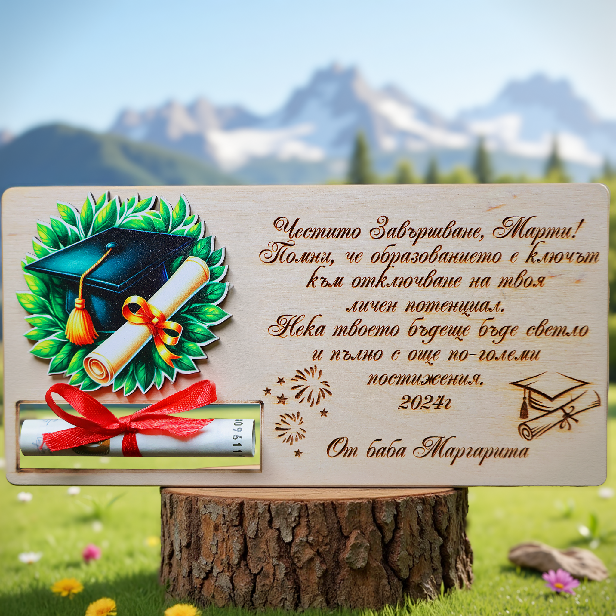 Вълшебството на завършването на училище е във възможността да се погледне назад към изминалия път и едновременно с това да се насочи поглед към бъдещето. Нашата дървена картичка за абитуриенти е повече от подарък; тя е символ на този преход, който се превръща в траен спомен за този значим момент..