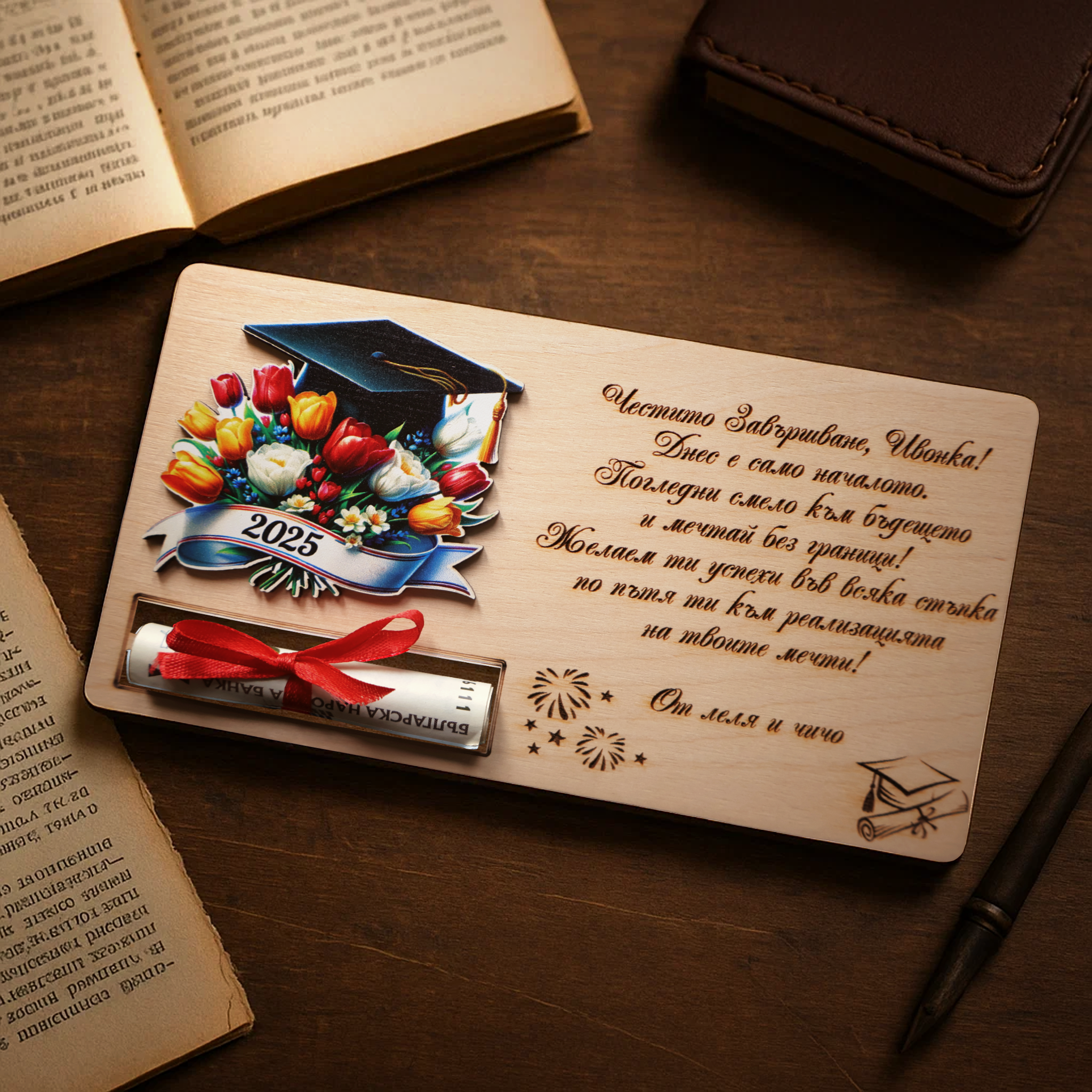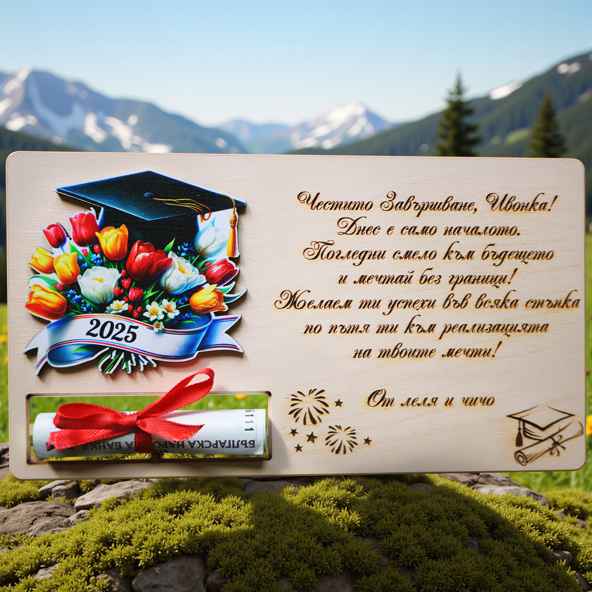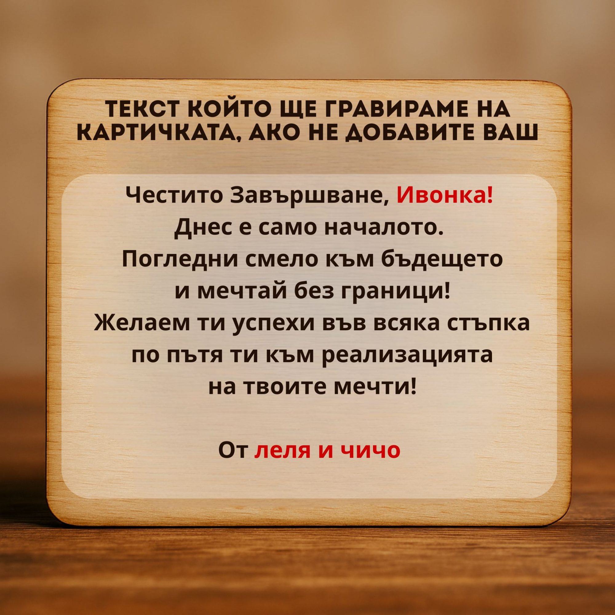 Завършването е момент на гордост и ново начало, заслужаващ специално отбелязване. Ако се чудите как да направите този ден още по-специален и запомнящ се, ние имаме идеалното решение – нашата дървена картичка за абитуриенти.С уникалното пожелание, което сте избрали, тя става истински неповторима (ако не впишете ваше пожелание ще сложим това като от снимката на продукта).
