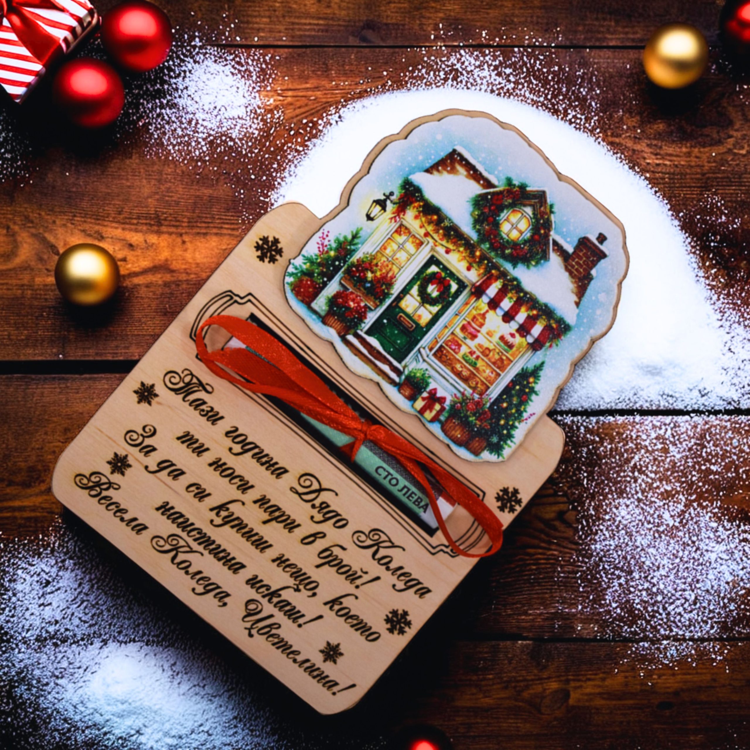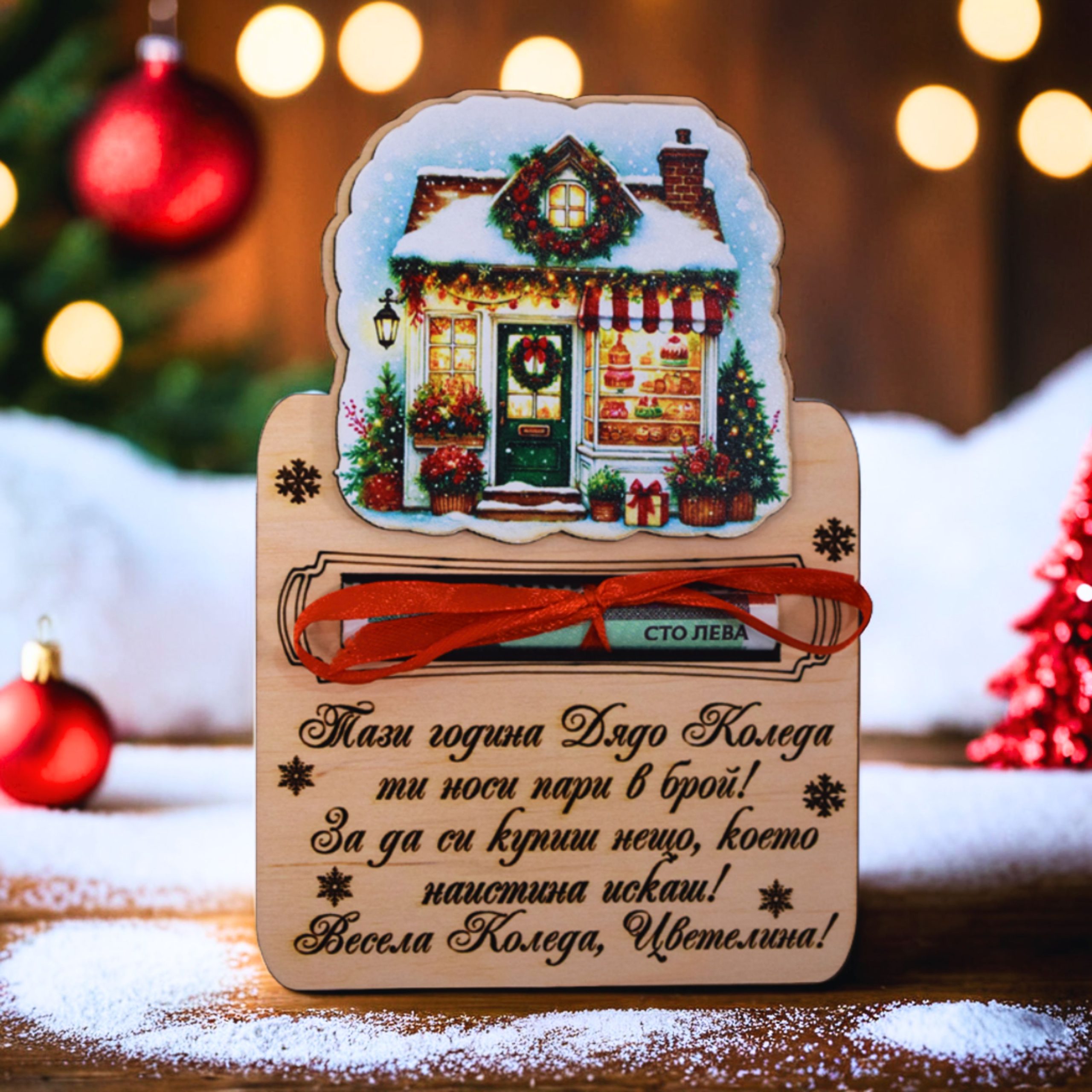 Тази кеш картичка, изработена от дърво, е не просто начин да подарите пари – тя е празничен и специален подарък, който носи духа на Коледа. С цветен елемент, изобразяващ уютна коледна пекарна, пълна с вкусни десерти и топлина, този подарък съчетава красотата на празничния декор с практичността на поднасянето на пари. Парите се завързват елегантно с червена панделка, а под тях има гравирано коледно пожелание и името на получателя.