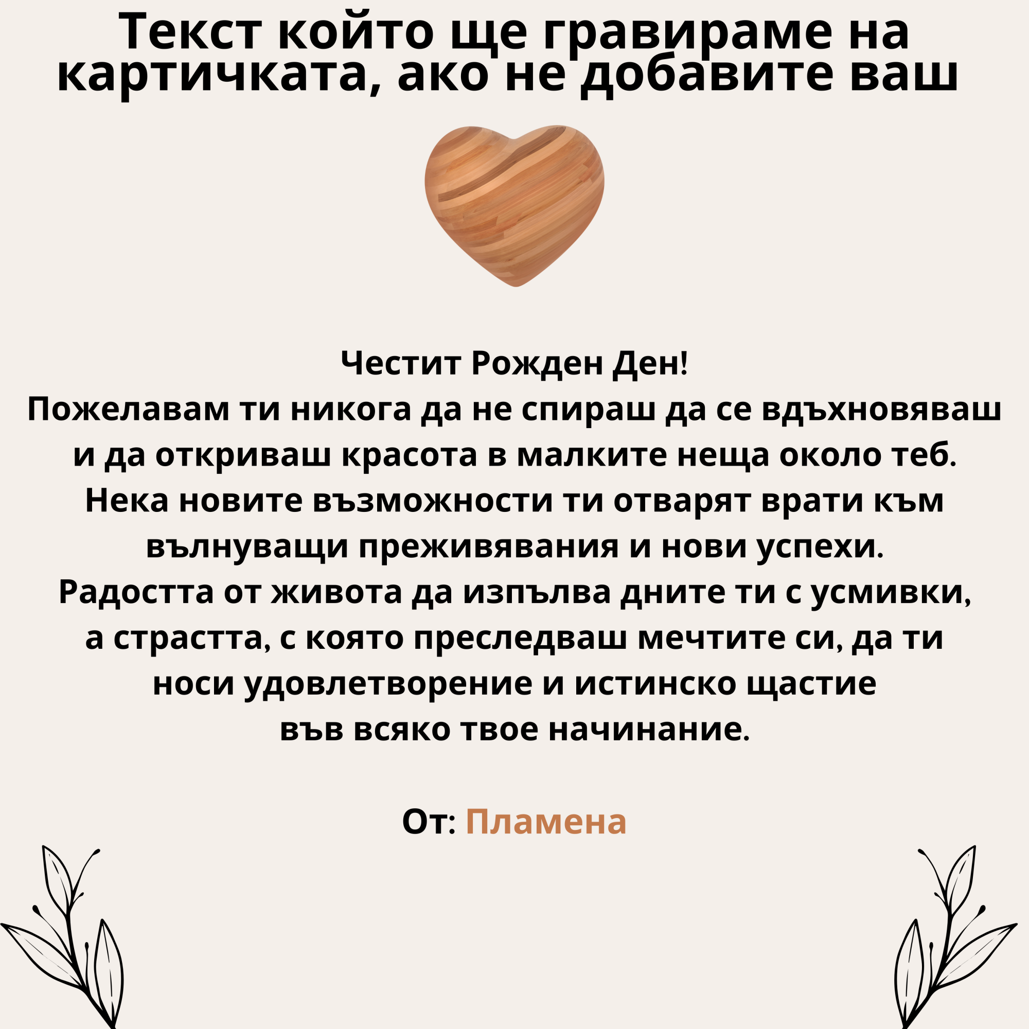 От дясната страна на картичката е гравирано персонализирано пожелание, което добавя специално и лично докосване към подаръка. Персонализацията ви позволява да изразите своите най-топли чувства и желания, създавайки уникален и запомнящ се момент за получателя. Няма по-добър начин да кажете „Честит рожден ден“ или да отбележите имен ден с този специален жест.