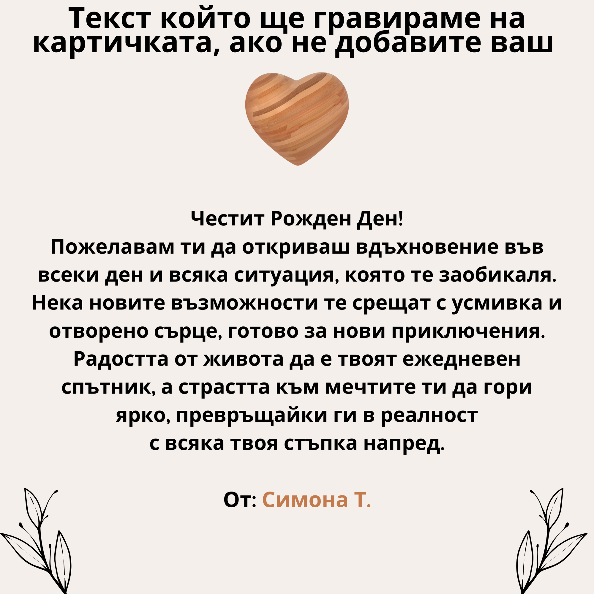 От дясната страна на картичката е гравирано персонализирано пожелание, което добавя специално и лично докосване към подаръка. Персонализацията ви позволява да изразите своите най-топли чувства и желания, създавайки уникален и запомнящ се момент за получателя. Няма по-добър начин да кажете „Честит рожден ден“ или да отбележите имен ден с този специален жест.