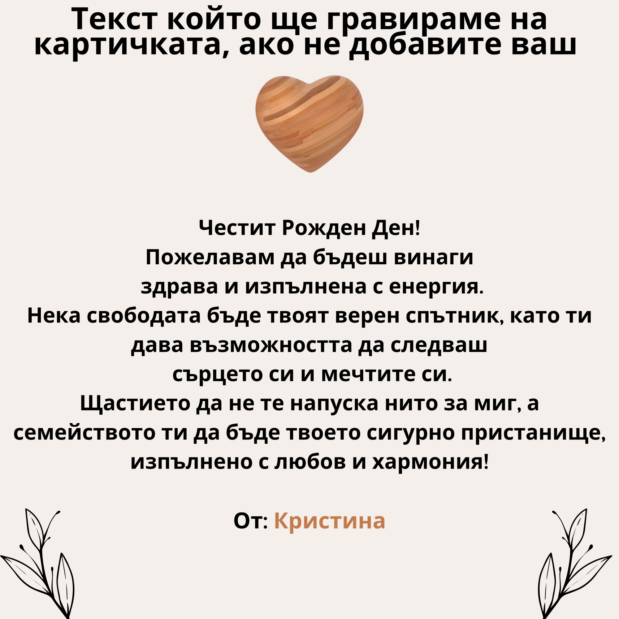 От дясната страна на картичката е гравирано персонализирано пожелание, което добавя специално и лично докосване към подаръка. Персонализацията ви позволява да изразите своите най-топли чувства и желания, създавайки уникален и запомнящ се момент за получателя. Няма по-добър начин да кажете „Честит рожден ден“ или да отбележите имен ден с този специален жест.