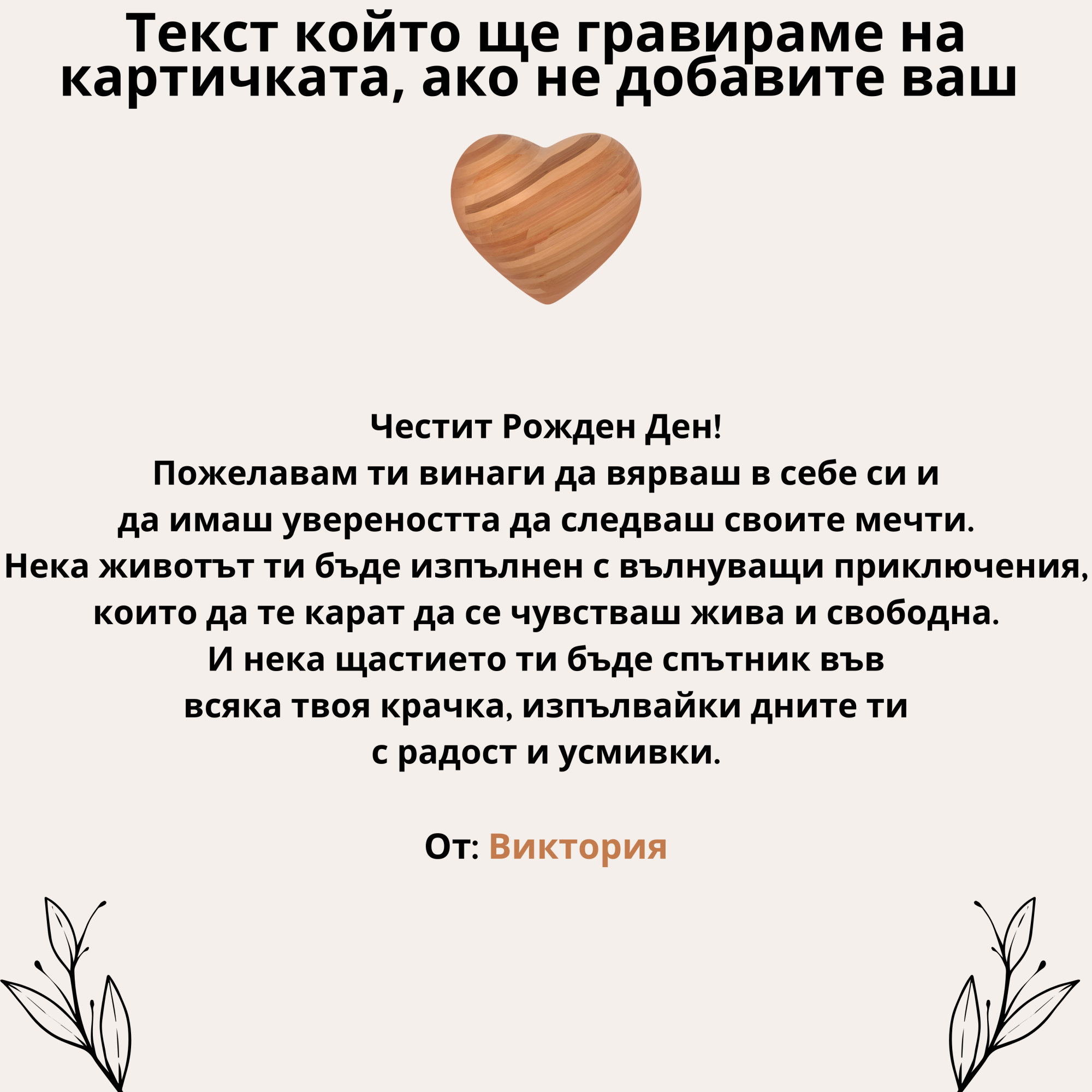 От дясната страна на картичката е гравирано персонализирано пожелание, което добавя специално и лично докосване към подаръка. Персонализацията ви позволява да изразите своите най-топли чувства и желания, създавайки уникален и запомнящ се момент за получателя. Няма по-добър начин да кажете „Честит рожден ден“ или да отбележите имен ден с този специален жест.