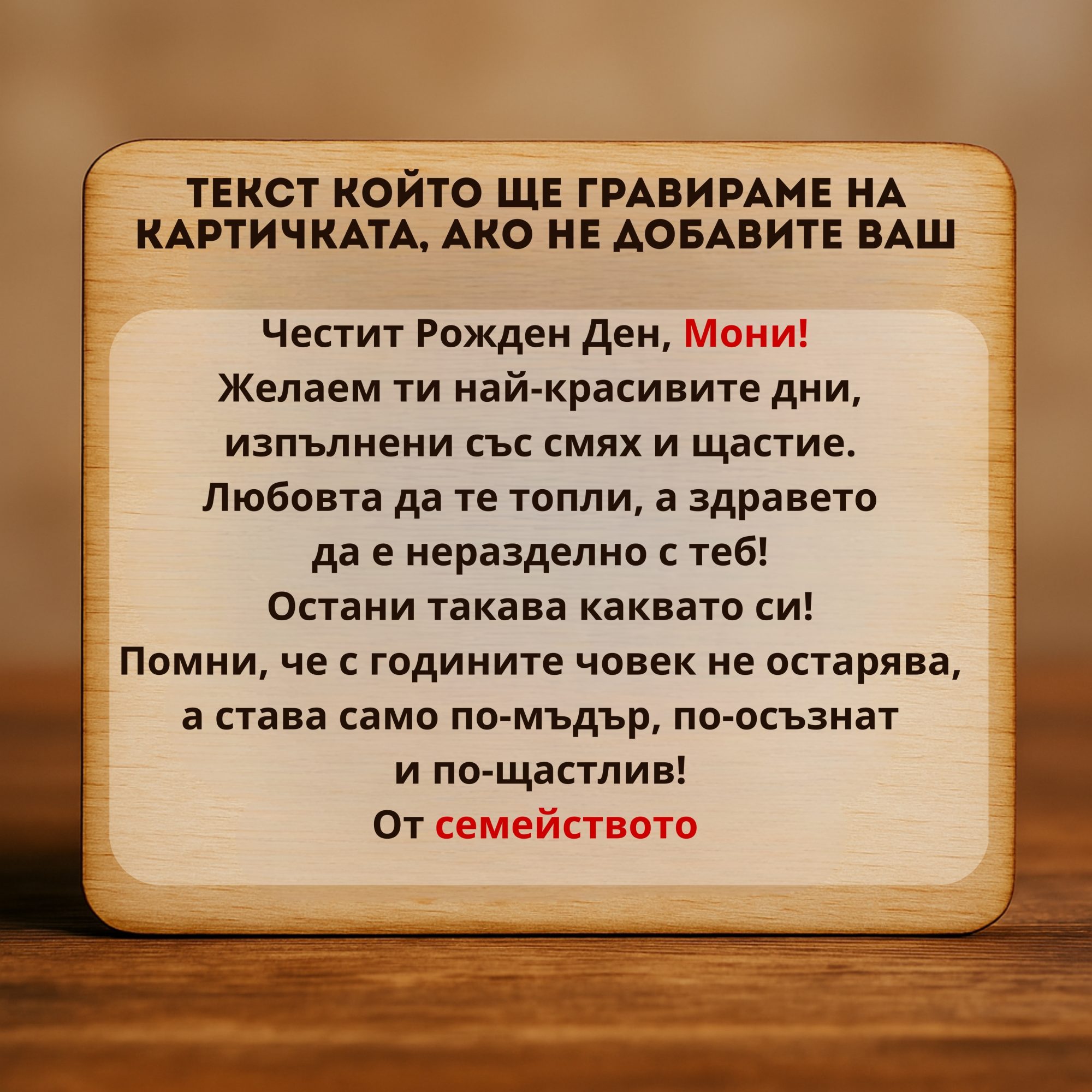 От дясната страна на картичката е гравирано персонализирано пожелание, което добавя специално и лично докосване към подаръка. Персонализацията ви позволява да изразите своите най-топли чувства и желания, създавайки уникален и запомнящ се момент за получателя. Няма по-добър начин да кажете „Честит рожден ден“ или да отбележите имен ден с този специален жест.