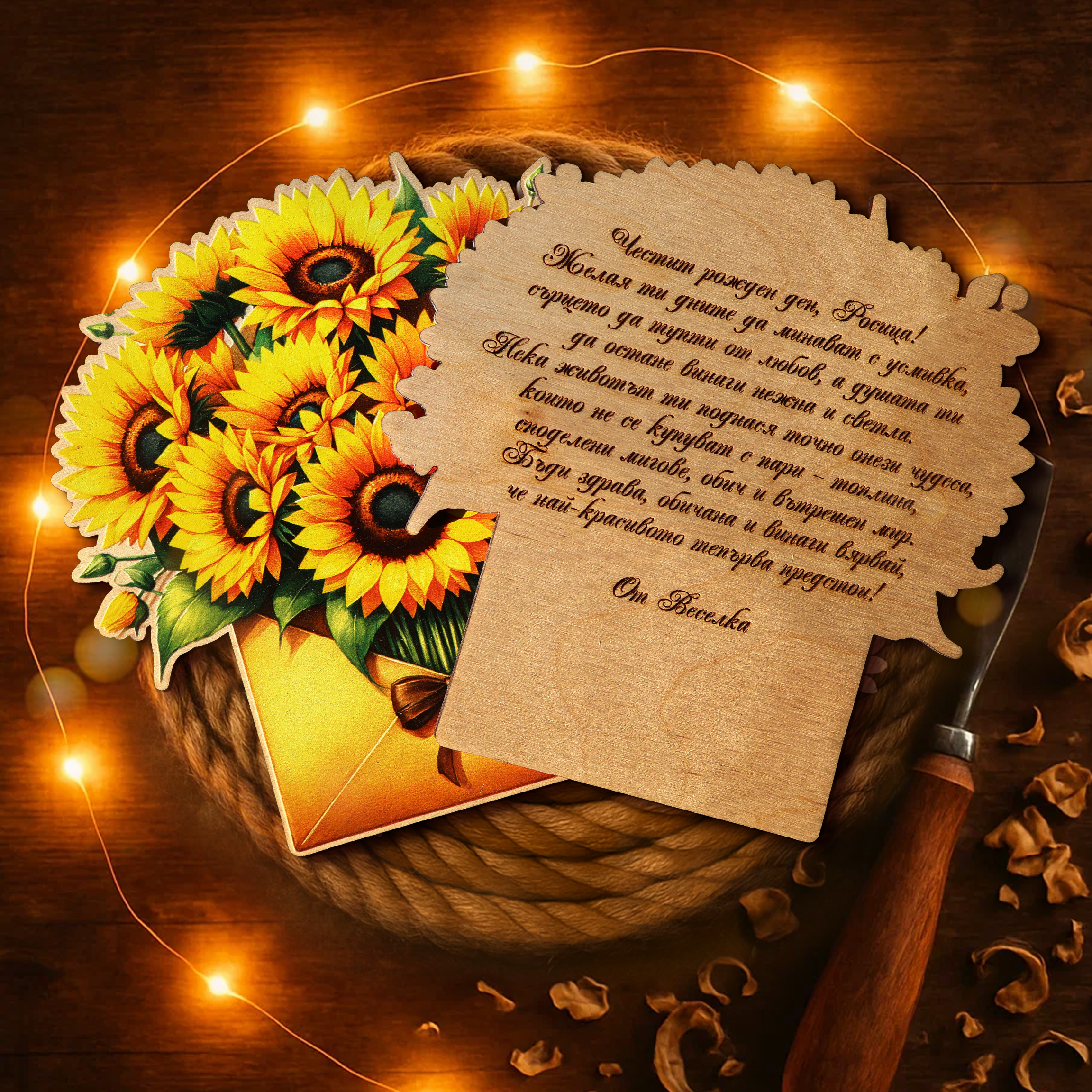 Открийте радостта от даряването с нашата изключителна дървена картичка, ода на светлината и топлината. С мотив на пощенски плик, от който извира пъстър букет от слънчогледи – символ на щастие, позитивизъм и дълголетие – тази картичка е уникален подарък, носещ блясъка на слънчеви лъчи. На гърба можете да гравирате ваше лично послание, което ще остане завинаги като символ на вечната връзка.